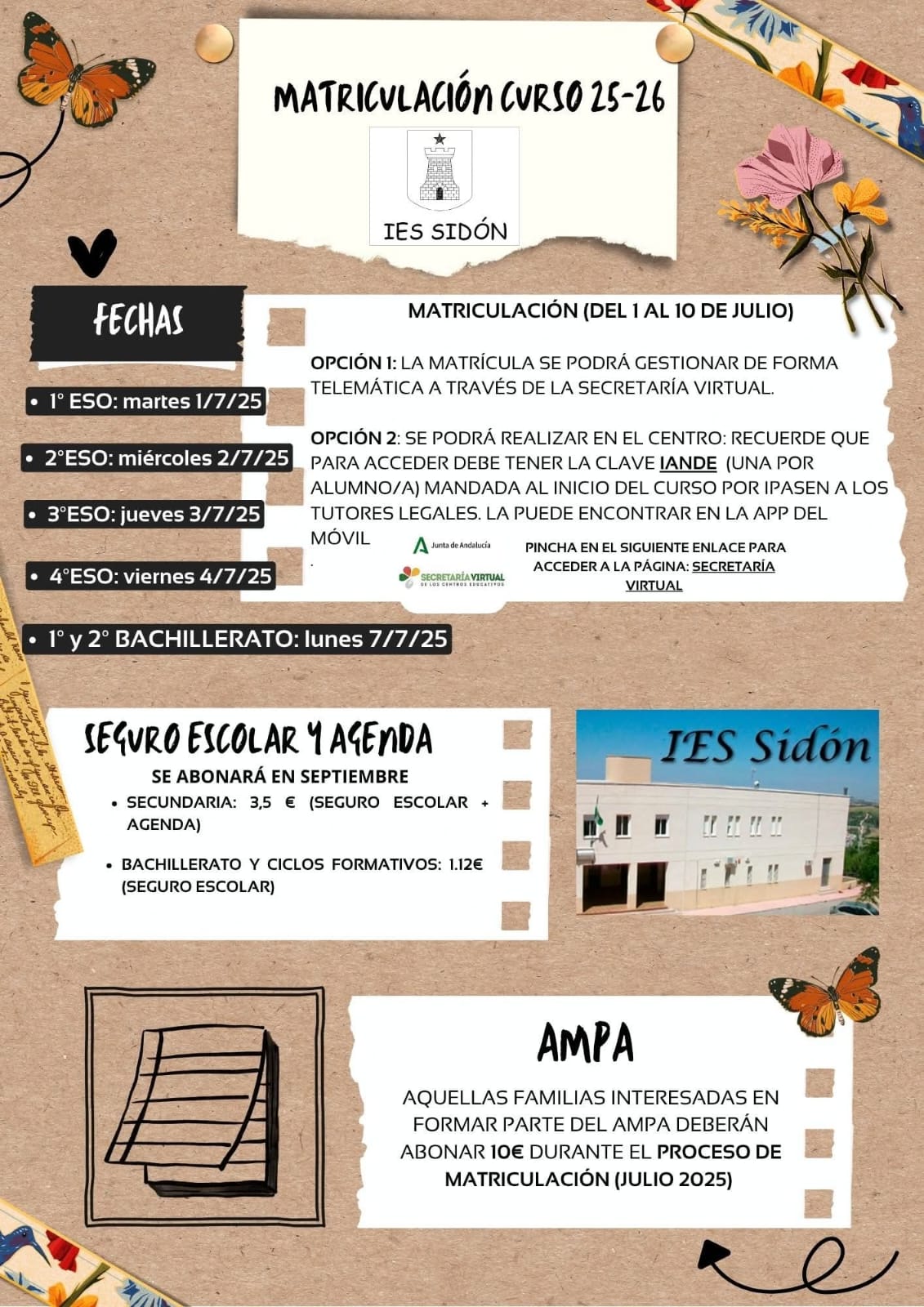 Segundos cursos: 1 fotografía, fotocopia del DNI (sólo si se es alumno nuevo o está caducado el que ya entregó otro año.), certificado de notas si se procede de otro centro y demás impresos que están incluidos en el sobre de matrícula que se facilita en conserjería.
